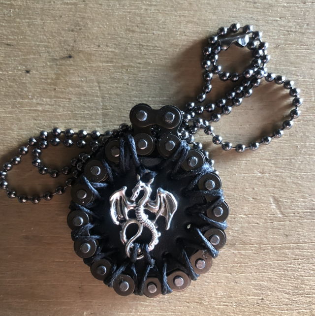 Pendentif cuir noir et chaine mini moto agrémenté d’un dragon en métal.diamètre du pendentif 3,5 cm.chaine à billes couleur gun métal